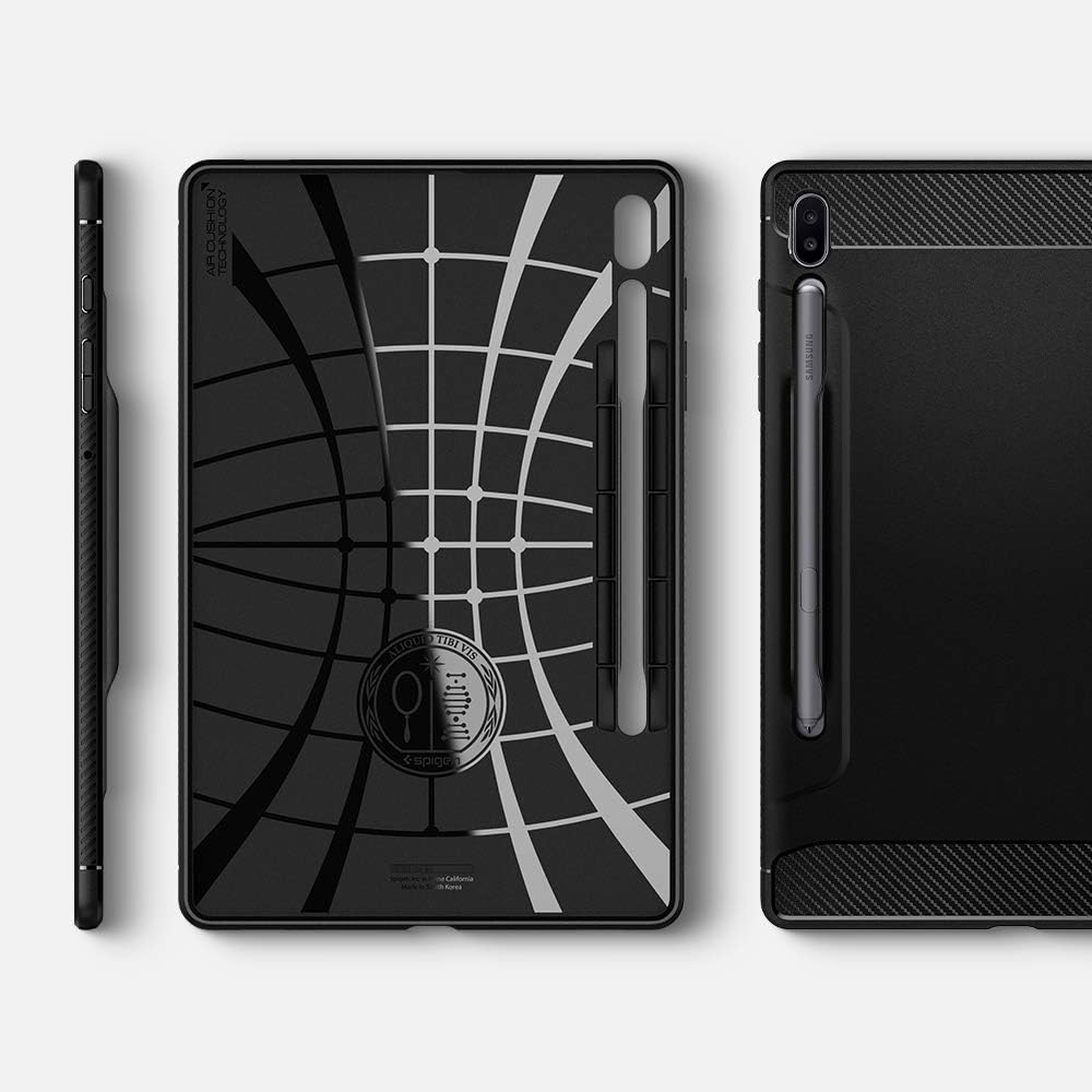 Чохол Rugged Armor від Spigen — це втілення простого та надійного захисту вашого Samsung Galaxy Tab S6. Він зроблений із тонкого, але ефективно поглинаючого удари TPU (термополіуретан). Оригінальна технологія Air Cushion надійно захищає кожен кут планшета, а підняті краї чохла захищають екран і фронтальну камеру від пошкоджень.